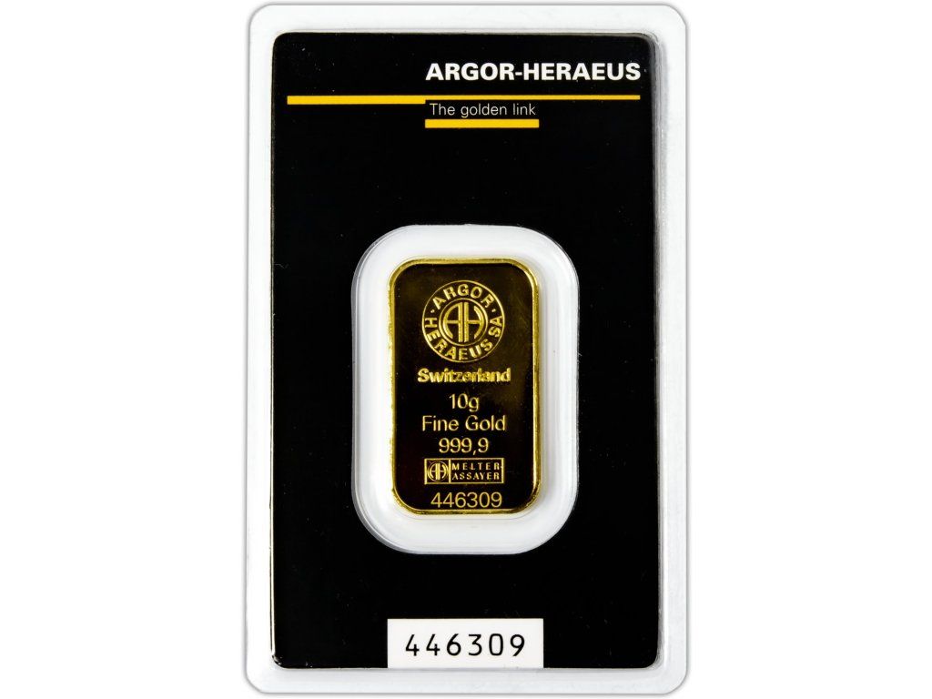 Investiční zlatý slitek Argor-Heraeus SA o hmotnosti 10 g představuje spolehlivou formu uložení kapitálu v ryzím zlatě. Slitek je vyroben ze zlata o ryzosti 999,9/1000 (24 karátů) a splňuje londýnský standard Good Delivery (LBMA), díky čemuž je bez problémů akceptován na všech světových trzích.